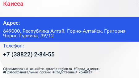 Каисса по адресу 649000, Республика Алтай, Горно-Алтайск, Григория Чорос-Гуркина, 39/12 в дальнейшем Организация, размещена в следующих категориях:
