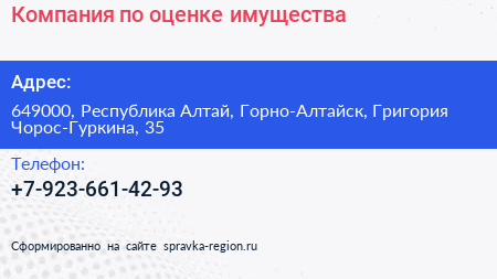 Компания по оценке имущества по адресу 649000, Республика Алтай, Горно-Алтайск, Григория Чорос-Гуркина, 35 в дальнейшем Организация, размещена в следующих категориях: