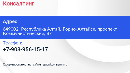 Консалтинг по адресу 649002, Республика Алтай, Горно-Алтайск, проспект Коммунистический, 87 в дальнейшем Организация, размещена в следующих категориях: