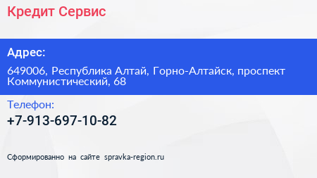 Кредит-Сервис по адресу 649006, Республика Алтай, Горно-Алтайск, проспект Коммунистический, 68 в дальнейшем Организация, размещена в следующих категориях: