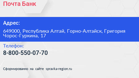 Почта Банк по адресу 649000, Республика Алтай, Горно-Алтайск, Григория Чорос-Гуркина, 17 в дальнейшем Организация, размещена в следующих категориях: