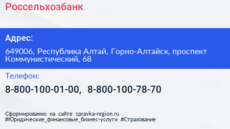 Россельхозбанк по адресу 649006, Республика Алтай, Горно-Алтайск, проспект Коммунистический, 68 в дальнейшем Организация, размещена в следующих категориях: