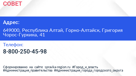 СОВЕТ по адресу 649000, Республика Алтай, Горно-Алтайск, Григория Чорос-Гуркина, 41 в дальнейшем Организация, размещена в следующих категориях:
