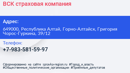 ВСК, страховая компания по адресу 649000, Республика Алтай, Горно-Алтайск, Григория Чорос-Гуркина, 39/12 в дальнейшем Организация, размещена в следующих категориях: