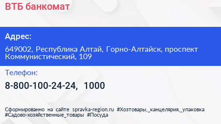 ВТБ, банкомат по адресу 649002, Республика Алтай, Горно-Алтайск, проспект Коммунистический, 109 в дальнейшем Организация, размещена в следующих категориях: