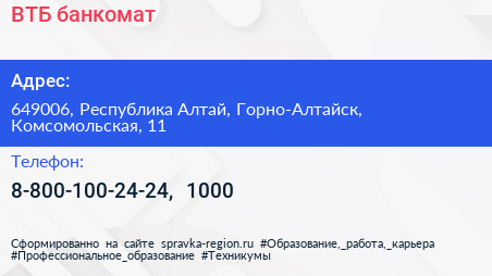ВТБ, банкомат по адресу 649006, Республика Алтай, Горно-Алтайск, Комсомольская, 11 в дальнейшем Организация, размещена в следующих категориях: