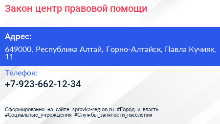 Закон, центр правовой помощи по адресу 649000, Республика Алтай, Горно-Алтайск, Павла Кучияк, 11 в дальнейшем Организация, размещена в следующих категориях: