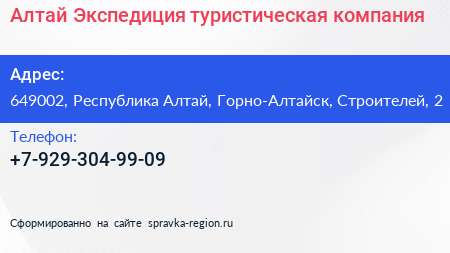 Алтай Экспедиция, туристическая компания по адресу 649002, Республика Алтай, Горно-Алтайск, Строителей, 2 в дальнейшем Организация, размещена в следующих категориях: