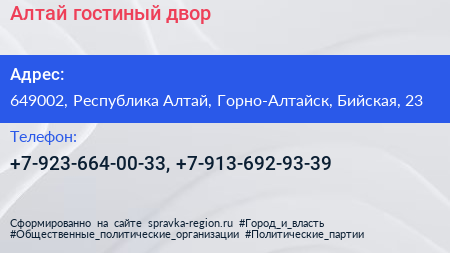 Алтай, гостиный двор по адресу 649002, Республика Алтай, Горно-Алтайск, Бийская, 23 в дальнейшем Организация, размещена в следующих категориях: