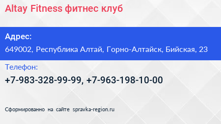 Altay Fitness, фитнес-клуб по адресу 649002, Республика Алтай, Горно-Алтайск, Бийская, 23 в дальнейшем Организация, размещена в следующих категориях: