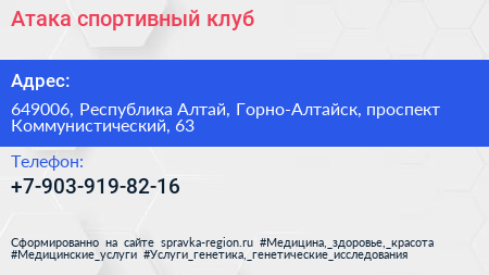 Атака, спортивный клуб по адресу 649006, Республика Алтай, Горно-Алтайск, проспект Коммунистический, 63 в дальнейшем Организация, размещена в следующих категориях: