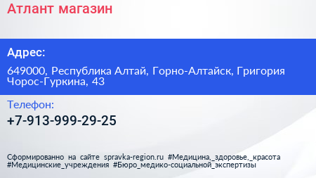 Атлант, магазин по адресу 649000, Республика Алтай, Горно-Алтайск, Григория Чорос-Гуркина, 43 в дальнейшем Организация, размещена в следующих категориях: