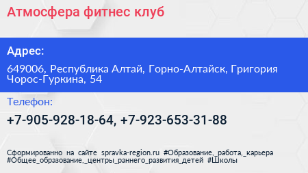 Атмосфера, фитнес-клуб по адресу 649006, Республика Алтай, Горно-Алтайск, Григория Чорос-Гуркина, 54 в дальнейшем Организация, размещена в следующих категориях: