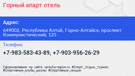 Горный, апарт-отель по адресу 649002, Республика Алтай, Горно-Алтайск, проспект Коммунистический, 125 в дальнейшем Организация, размещена в следующих категориях: