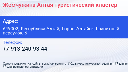 Жемчужина Алтая, туристический кластер по адресу 649002, Республика Алтай, Горно-Алтайск, Гранитный переулок, 6 в дальнейшем Организация, размещена в следующих категориях: