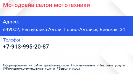 Мотодрайв, салон мототехники по адресу 649002, Республика Алтай, Горно-Алтайск, Бийская, 34 в дальнейшем Организация, размещена в следующих категориях: