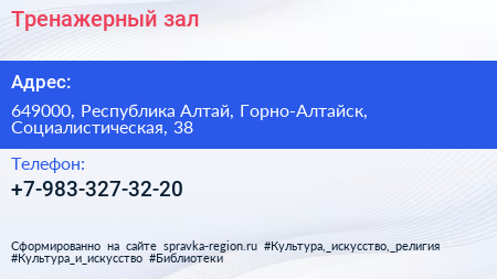 Тренажерный зал по адресу 649000, Республика Алтай, Горно-Алтайск, Социалистическая, 38 в дальнейшем Организация, размещена в следующих категориях:
