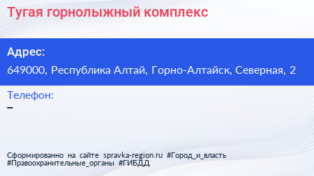 Тугая, горнолыжный комплекс по адресу 649000, Республика Алтай, Горно-Алтайск, Северная, 2 в дальнейшем Организация, размещена в следующих категориях:
