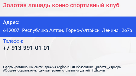 Золотая лошадь, конно-спортивный клуб по адресу 649007, Республика Алтай, Горно-Алтайск, Ленина, 267а в дальнейшем Организация, размещена в следующих категориях: