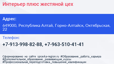 Интерьер плюс, жестяной цех по адресу 649000, Республика Алтай, Горно-Алтайск, Октябрьская, 22 в дальнейшем Организация, размещена в следующих категориях:
