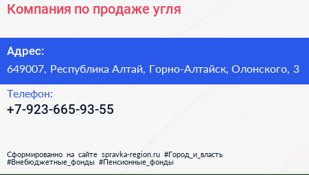 Компания по продаже угля по адресу 649007, Республика Алтай, Горно-Алтайск, Олонского, 3 в дальнейшем Организация, размещена в следующих категориях: