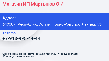 Магазин, ИП Мартынов О.И. по адресу 649007, Республика Алтай, Горно-Алтайск, Ленина, 95 в дальнейшем Организация, размещена в следующих категориях:
