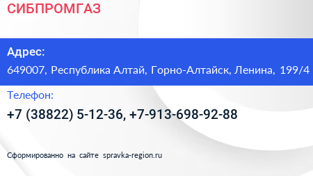 СИБПРОМГАЗ по адресу 649007, Республика Алтай, Горно-Алтайск, Ленина, 199/4 в дальнейшем Организация, размещена в следующих категориях: