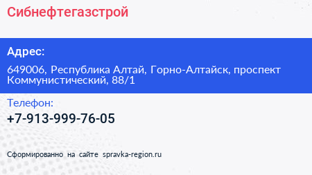 Сибнефтегазстрой по адресу 649006, Республика Алтай, Горно-Алтайск, проспект Коммунистический, 88/1 в дальнейшем Организация, размещена в следующих категориях: