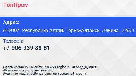ТопПром по адресу 649007, Республика Алтай, Горно-Алтайск, Ленина, 226/1 в дальнейшем Организация, размещена в следующих категориях: