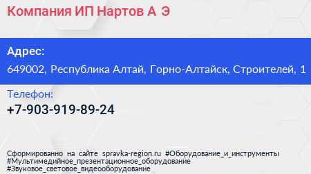 Компания, ИП Нартов А.Э. по адресу 649002, Республика Алтай, Горно-Алтайск, Строителей, 1 в дальнейшем Организация, размещена в следующих категориях: