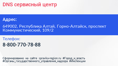 DNS, сервисный центр по адресу 649002, Республика Алтай, Горно-Алтайск, проспект Коммунистический, 109/2 в дальнейшем Организация, размещена в следующих категориях: