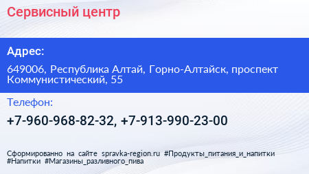 Сервисный центр по адресу 649006, Республика Алтай, Горно-Алтайск, проспект Коммунистический, 55 в дальнейшем Организация, размещена в следующих категориях: