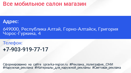 Все мобильное, салон-магазин по адресу 649000, Республика Алтай, Горно-Алтайск, Григория Чорос-Гуркина, 4 в дальнейшем Организация, размещена в следующих категориях: