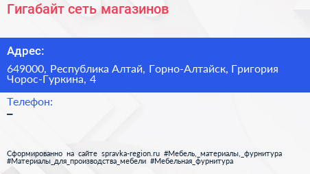 Гигабайт, сеть магазинов по адресу 649000, Республика Алтай, Горно-Алтайск, Григория Чорос-Гуркина, 4 в дальнейшем Организация, размещена в следующих категориях:
