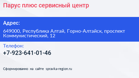 Парус плюс, сервисный центр по адресу 649000, Республика Алтай, Горно-Алтайск, проспект Коммунистический, 12 в дальнейшем Организация, размещена в следующих категориях: