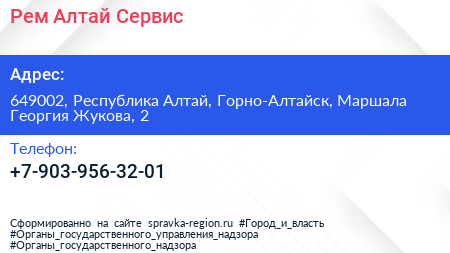 Рем Алтай Сервис+ по адресу 649002, Республика Алтай, Горно-Алтайск, Маршала Георгия Жукова, 2 в дальнейшем Организация, размещена в следующих категориях:
