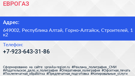 ЕВРОГАЗ по адресу 649002, Республика Алтай, Горно-Алтайск, Строителей, 1 к2 в дальнейшем Организация, размещена в следующих категориях: