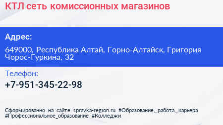 КТЛ, сеть комиссионных магазинов по адресу 649000, Республика Алтай, Горно-Алтайск, Григория Чорос-Гуркина, 32 в дальнейшем Организация, размещена в следующих категориях: