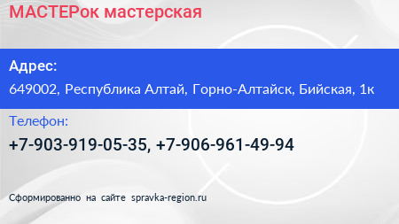 МАСТЕРок, мастерская по адресу 649002, Республика Алтай, Горно-Алтайск, Бийская, 1к в дальнейшем Организация, размещена в следующих категориях: