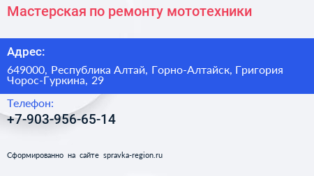 Мастерская по ремонту мототехники по адресу 649000, Республика Алтай, Горно-Алтайск, Григория Чорос-Гуркина, 29 в дальнейшем Организация, размещена в следующих категориях: