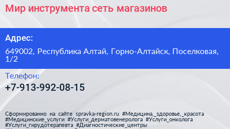 Мир инструмента, сеть магазинов по адресу 649002, Республика Алтай, Горно-Алтайск, Поселковая, 1/2 в дальнейшем Организация, размещена в следующих категориях: