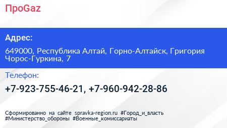 ПроGaz по адресу 649000, Республика Алтай, Горно-Алтайск, Григория Чорос-Гуркина, 7 в дальнейшем Организация, размещена в следующих категориях: