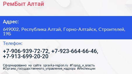 РемБыт Алтай по адресу 649002, Республика Алтай, Горно-Алтайск, Строителей, 19Б в дальнейшем Организация, размещена в следующих категориях: