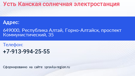 Усть-Канская солнечная электростанция по адресу 649000, Республика Алтай, Горно-Алтайск, проспект Коммунистический, 35 в дальнейшем Организация, размещена в следующих категориях: