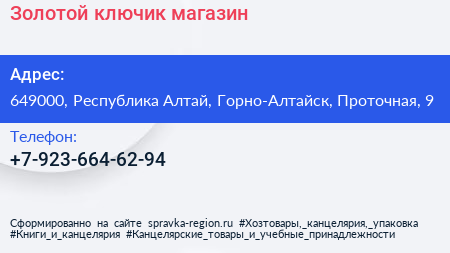 Золотой ключик, магазин по адресу 649000, Республика Алтай, Горно-Алтайск, Проточная, 9 в дальнейшем Организация, размещена в следующих категориях: