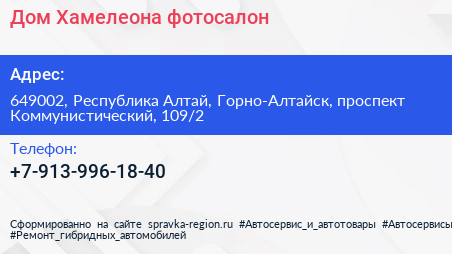 Дом Хамелеона, фотосалон по адресу 649002, Республика Алтай, Горно-Алтайск, проспект Коммунистический, 109/2 в дальнейшем Организация, размещена в следующих категориях:
