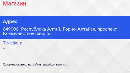 Магазин по адресу 649006, Республика Алтай, Горно-Алтайск, проспект Коммунистический, 55 в дальнейшем Организация, размещена в следующих категориях: