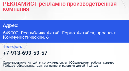 РЕКЛАМИСТ, рекламно-производственная компания по адресу 649000, Республика Алтай, Горно-Алтайск, проспект Коммунистический, 6 в дальнейшем Организация, размещена в следующих категориях: