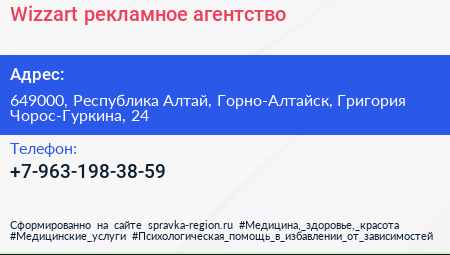Wizzart, рекламное агентство по адресу 649000, Республика Алтай, Горно-Алтайск, Григория Чорос-Гуркина, 24 в дальнейшем Организация, размещена в следующих категориях: