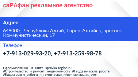 саРАфан, рекламное агентство по адресу 649000, Республика Алтай, Горно-Алтайск, проспект Коммунистический, 17 в дальнейшем Организация, размещена в следующих категориях: